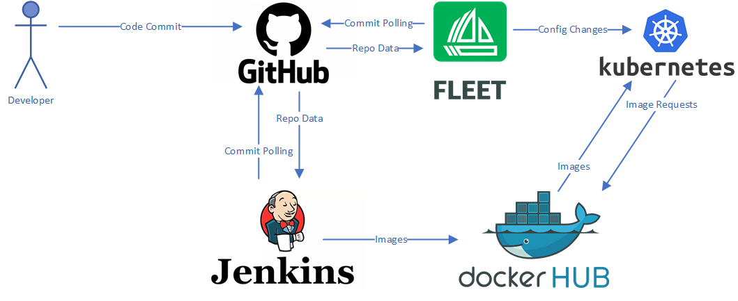- Fleet - An orchestration engine that runs in Kubernetes, Fleet watches Git for config changes and deploys changes automatically.