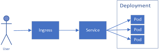 - Service - This is, essentially a way to target all of the pods in a deployment, by label. With a service, you can send traffic from another service, or an ingress, to any active pod behind that service, without having to know individual pod names or IPs.